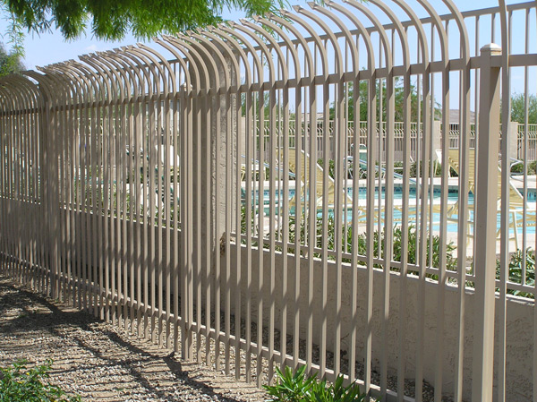 This 6' tall security fencing will discourage most unwanted visitors. With the pinched picket spears on top and the shepherds hooks making it difficult to climb, this is "typical" security fencing. Materials are upsized for strength and security. (In this image, there is a traditional pool fence in back of the security fencing.)